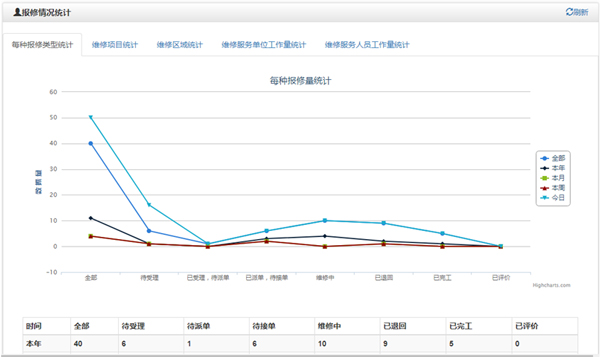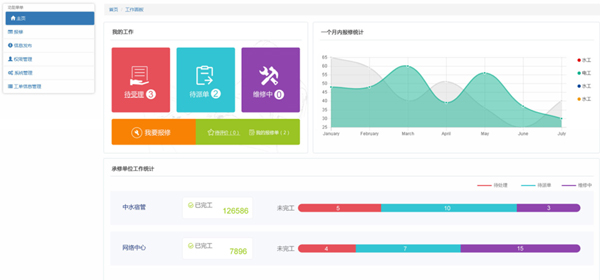 可以根據報修區域、報修項目、承修單位、維修工等統計報修量,圖表展示各類報修情況。