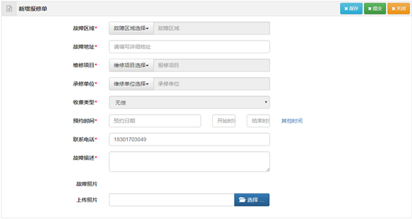 用戶可以在線填寫報修單。包括故障區域、故障地址、維修項目、預約時間、聯系電話、故障描述,可以上傳故障照片。用戶也可以電話報修,接到電話后由電話接線員替用戶錄入報修單。