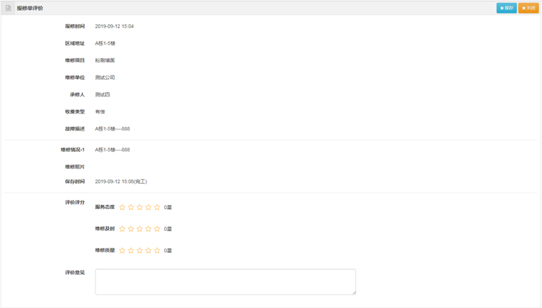 維修完工后,報修人可以對本次報修的維修情況進行評價。管理員可設置有哪些評價項目,如:服務態度、維修及時、維修質量等。