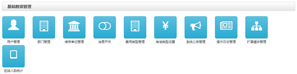 維修區域管理、維修項目管理、部門管理、維修服務單位管理、用戶管理、維修服務單位管理員設置、維修服務單位設置、維修服務單位服務范圍設置、維修服務人員服務范圍設置、收費類型設置、消息設置、系統公告等。