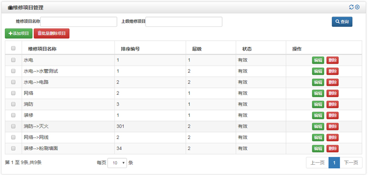 建立維修項目信息,便于按不同維修項目指派不同的維修人,維修項目可分多級,比如第一級分成:水、電、木、泥、油漆、金屬、室外、暖氣、網絡等,第一級水又可以分成水龍頭、水管、閥門等二級項目。