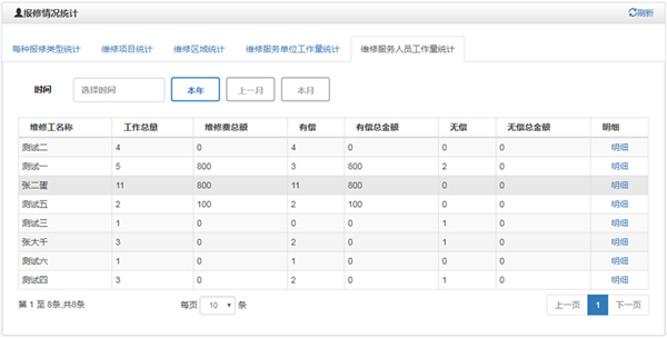 可以統計各個承修單位的工作量、各個維修服務人員的工作量,報修的收費情況等,便于了解維修情況,對各維修服務單位進行考核。