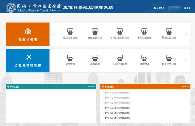 我司為同濟大學口腔醫學院開發的課題組管理系統,包括“成員信息管理”、“開題報告管理”、“匯報管理”、“考勤管理”、“額度管理”、“申購管理”、“報銷管理”、“供應商管理”、“系統管理”等模塊。