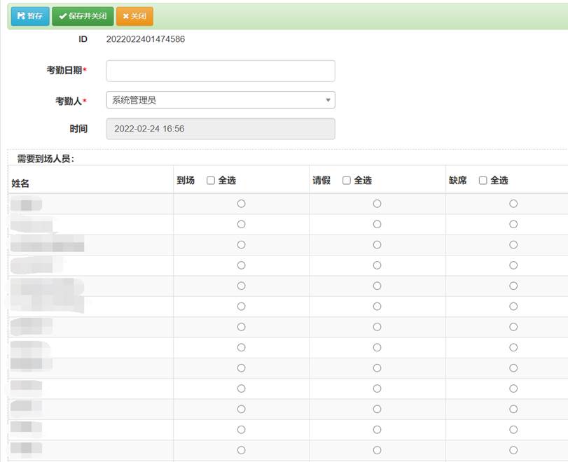 組會考勤人員對考勤進行管理,考勤人員選擇組會,系統列出該組會需要到場人員,考勤人員對到場人員和匯報人員進行勾選。