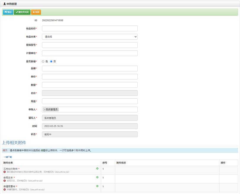 所有成員都可以進行申購,根據個人或者公共需求進行申購,申購時會對額度的設置進行校驗,然后提交到管理員處進行審核,通過之后即可進行入庫。