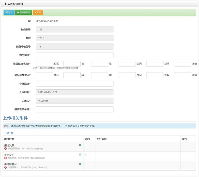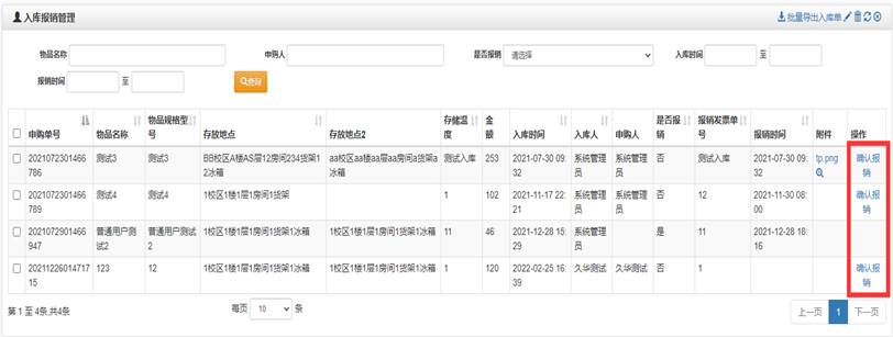 入庫后需要進行報銷管理,內容包括發票號、金額、對應的入庫信息等,可上傳發票,由專人進行審核確認,完成對發票信息的電子化管理。