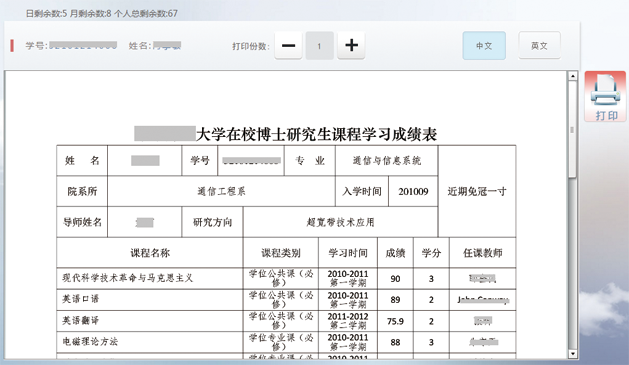 學生登錄后可打印成績單或在學證明,選擇打印類型后,可以看到自己的剩余打印份數,有中英文時可選擇語種,可看到打印預覽界面,確認后打??;若終端機設置了只允許一種打印,則登錄后直接進入預覽界面。